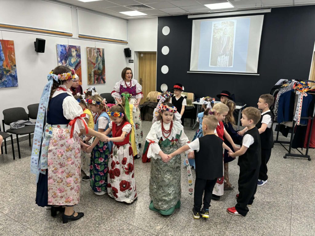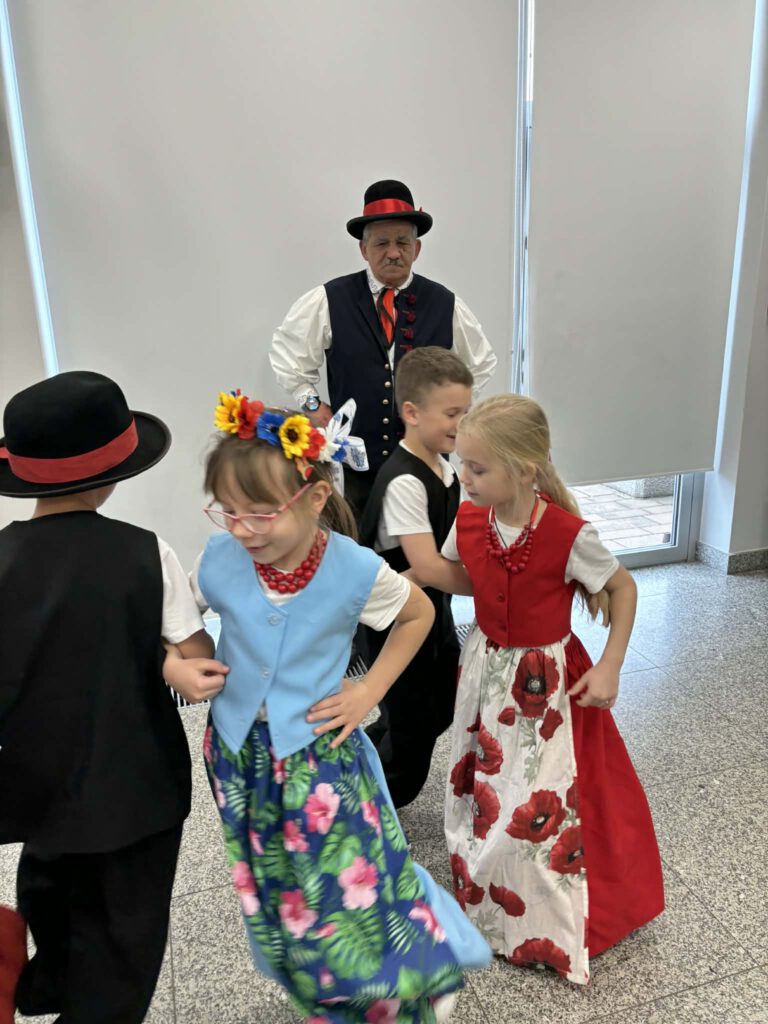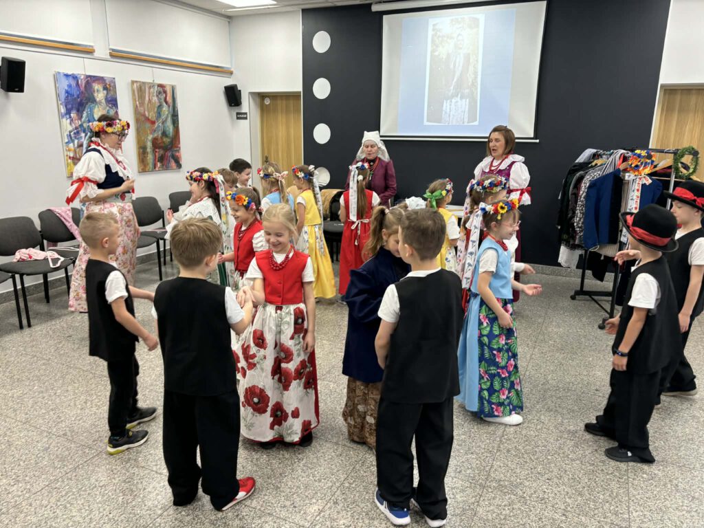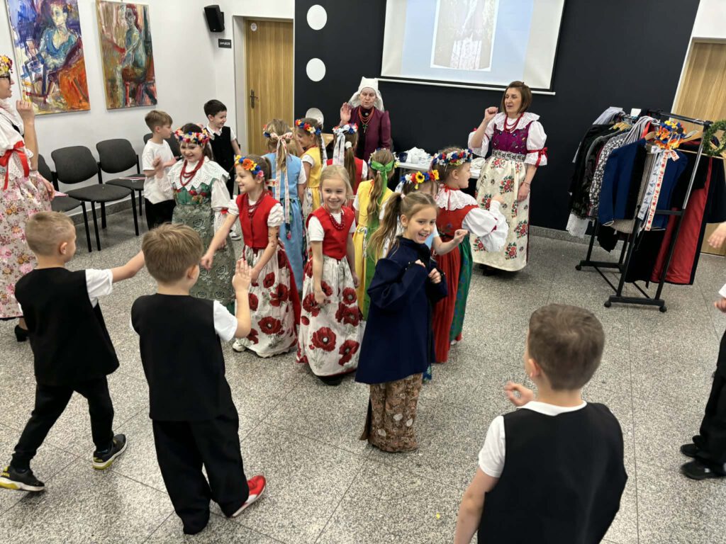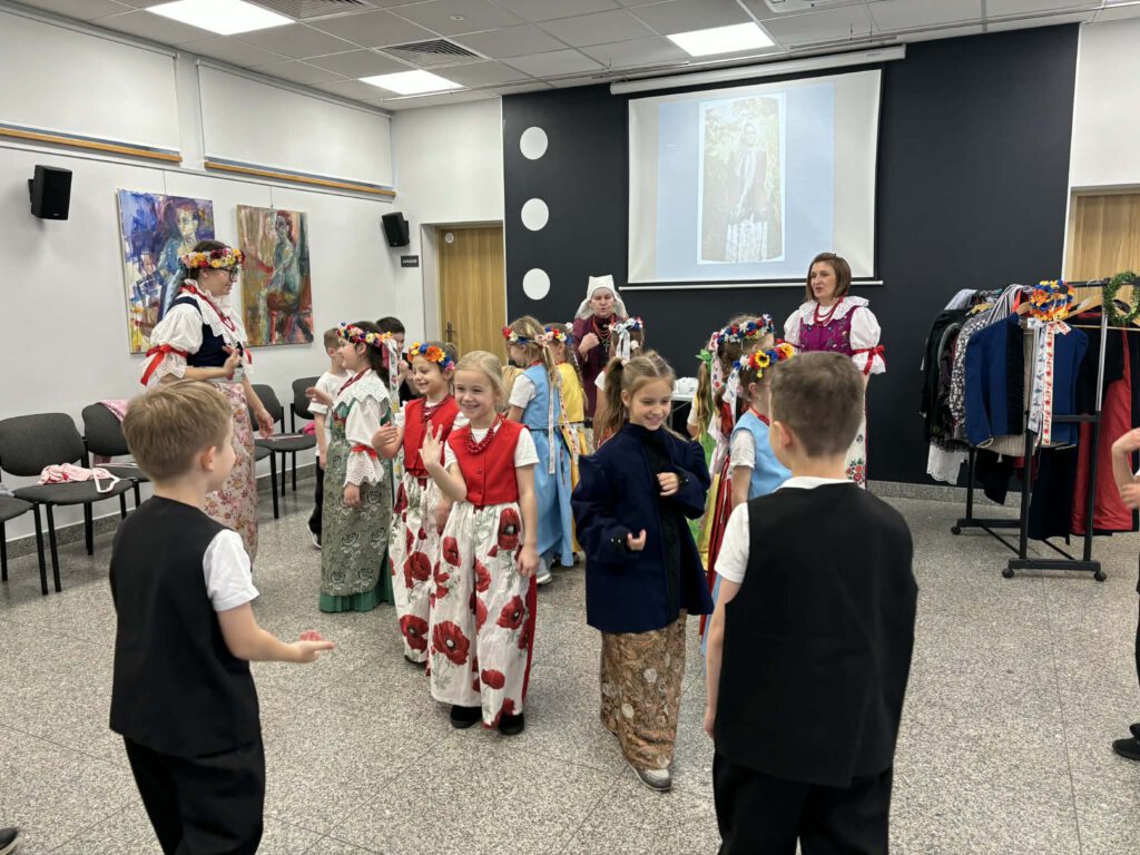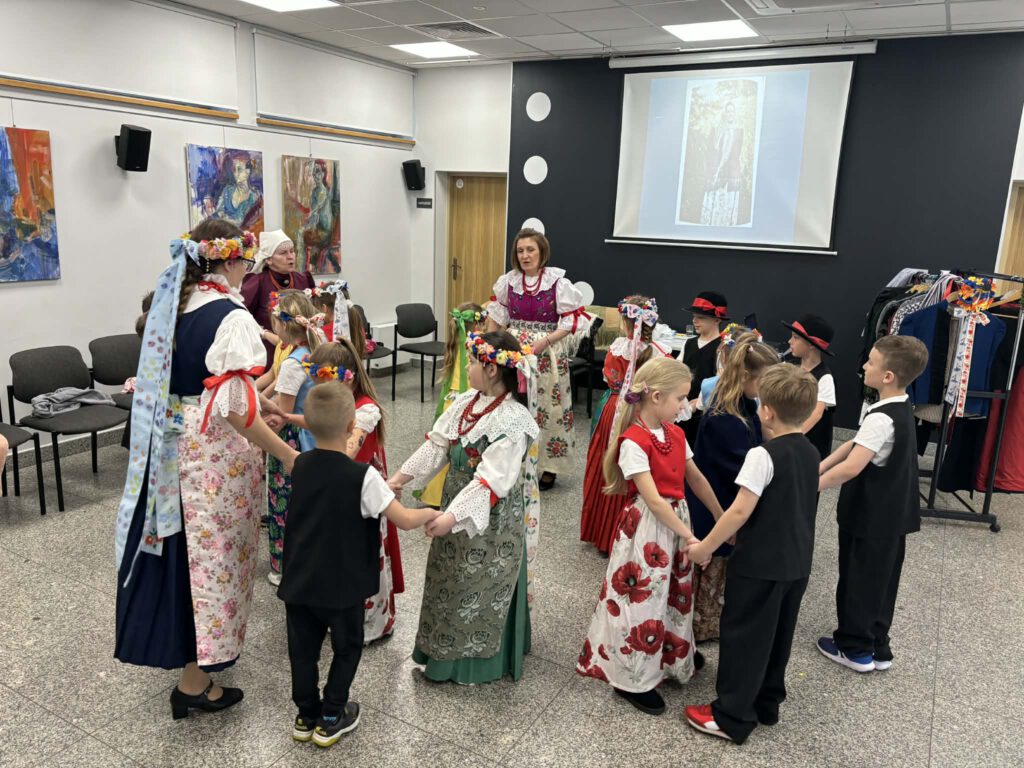 Stroje śląskie i powtórka tańców z klasą I b Szkoła Podstawowa im. Wilhelma Gawlikowicza w Bojszowach Zespół folklorystyczny Bojszowianie