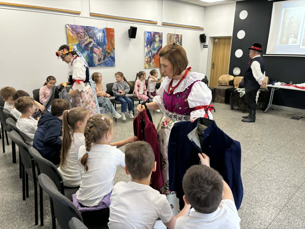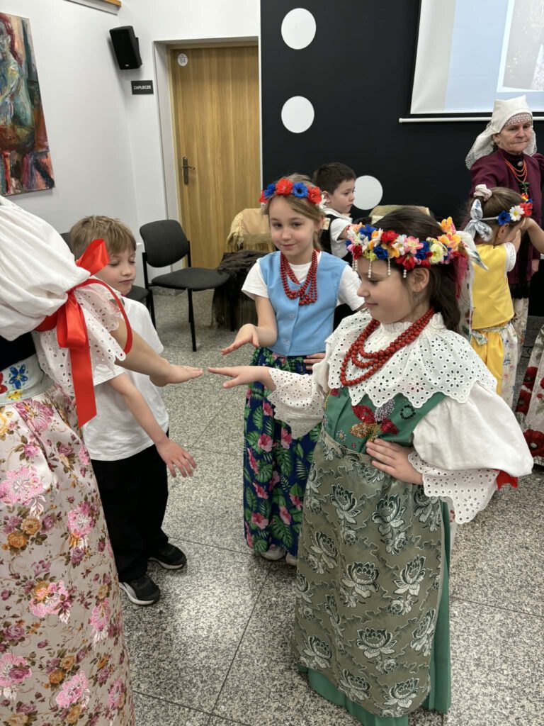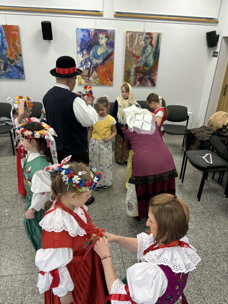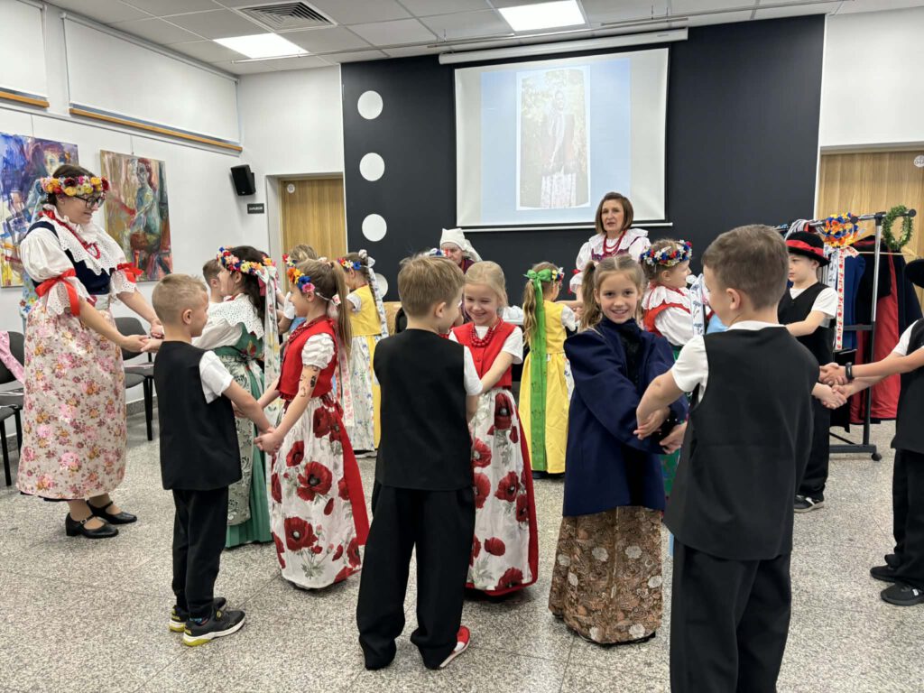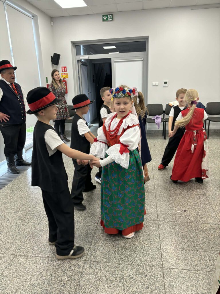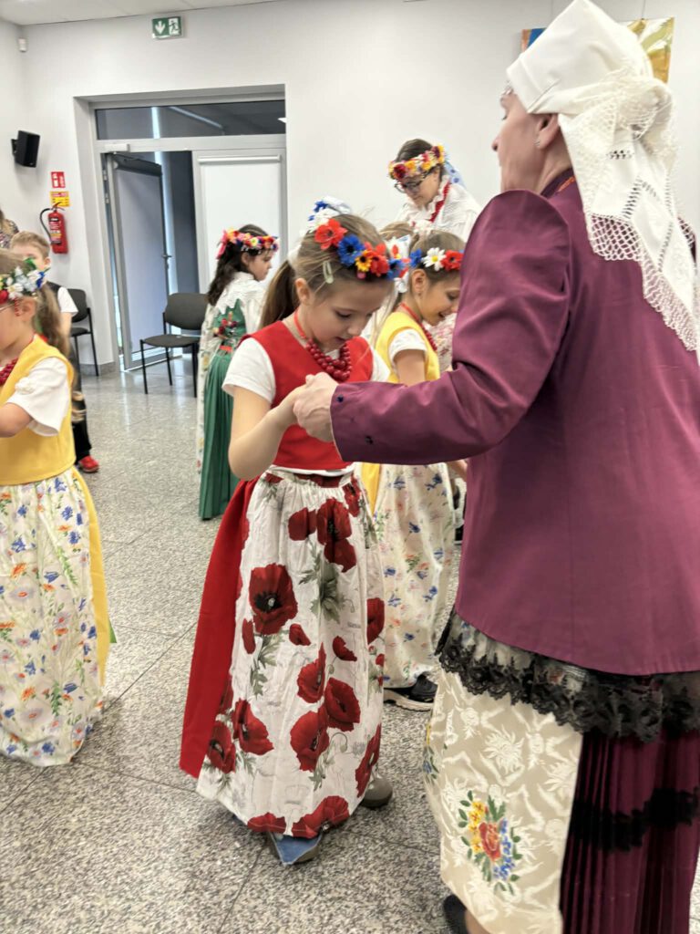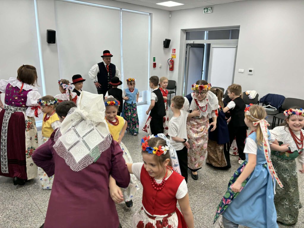 Stroje śląskie i powtórka tańców z klasą I b Szkoła Podstawowa im. Wilhelma Gawlikowicza w Bojszowach Zespół folklorystyczny Bojszowianie